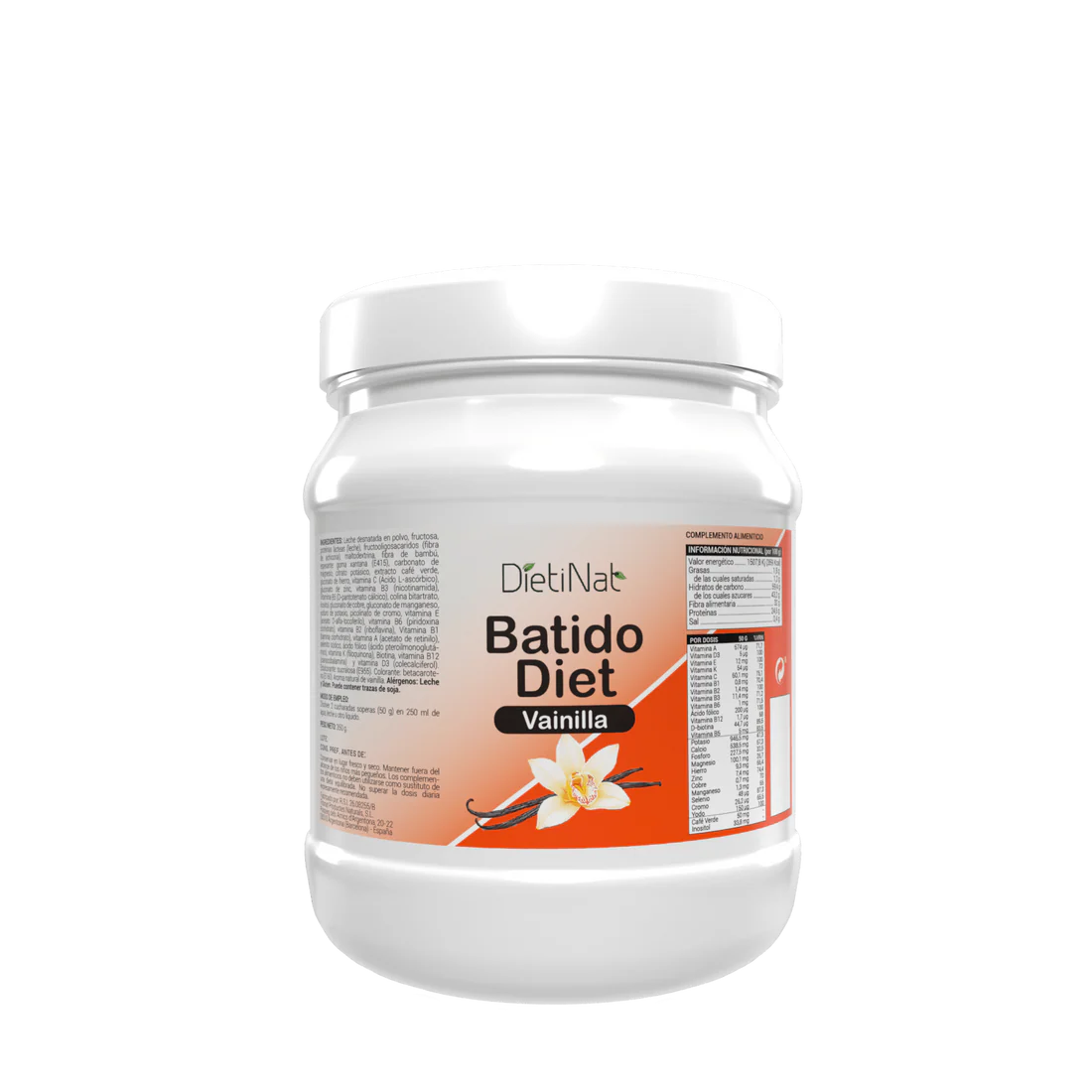 Leche desnatada en polvo, fructosa, proteínas lácteas (leche), fructooligosacaridos (fibra de achicoria), maltodextrina, fibra de bambú, espesante: goma xantana (E415), carbonato de magnesio, citrato potásico, extracto café verde, gluconato de hierro, vitamina C (Ácido L-ascórbico), gluconato de zinc, vitamina B3 (nicotinamida), Vitamina B5 (D-pantotenato cálcico), colina bitartrato, inositol, gluconato de cobre, gluconato de manganeso, yoduro de potasio, picolinato de cromo, vitamina E (acetato D-alfa-tocoferilo), vitamina B6 (piridoxina clorhidrato), vitamina B2 (riboflavina), Vitamina B1 (tiamina clorhidrato), vitamina A (acetato de retinilo), selenito sódico, ácido fólico (ácido pteroilmonoglutámico), vitamina K (filoquinona), Biotina, vitamina B12 (cianocobalamina) y vitamina D3 (colecalciferol). Edulcorante: sucralosa (E955). Colorante: betacaroteno (E160). Aroma natural de vainilla. Alérgenos: Leche y Gluten. Puede contener trazas de soja.