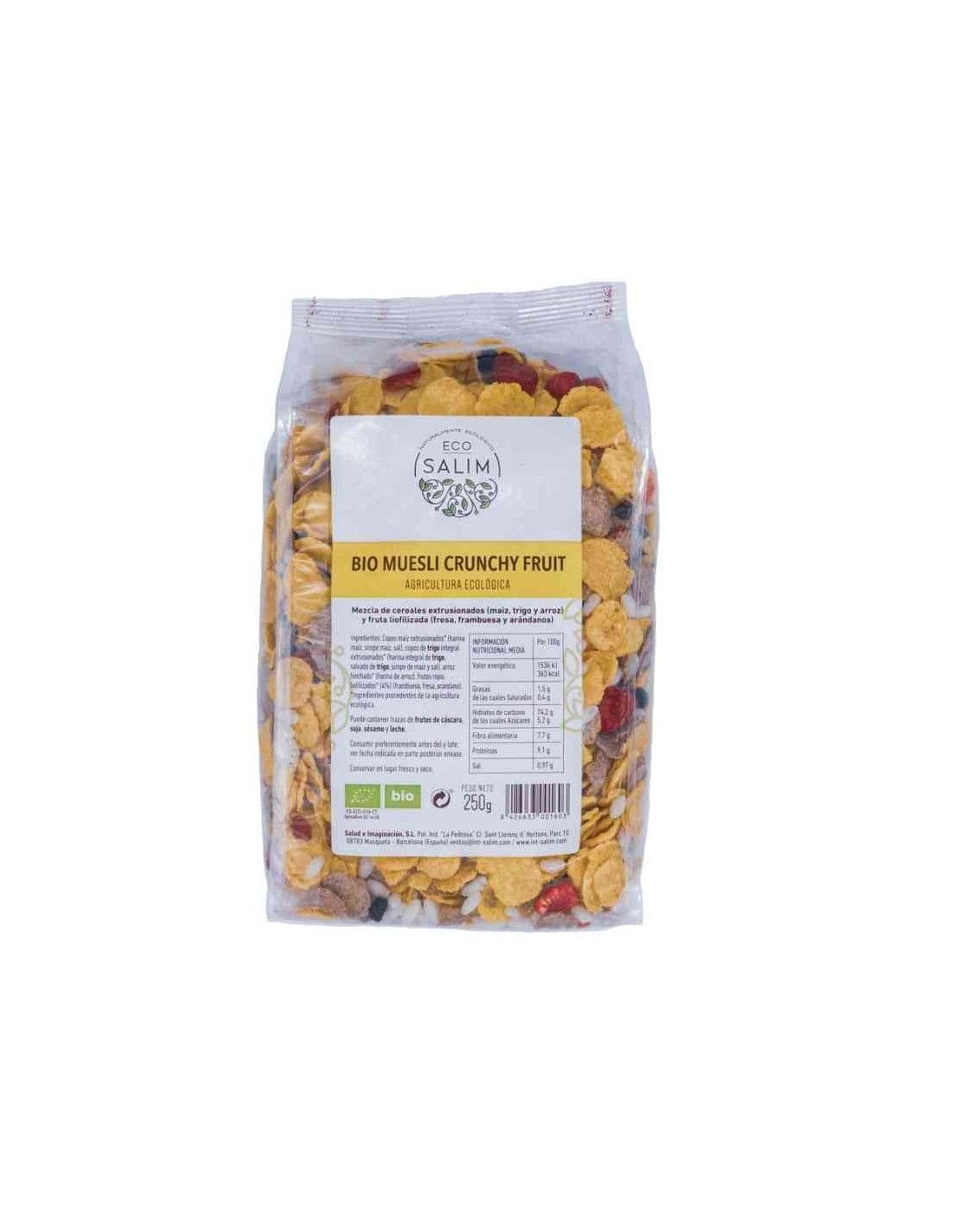 Es una mezcla de cereales extrusionados (maíz, trigo y arroz) y fruta liofilizada (fresa, frambuesa y arándano).