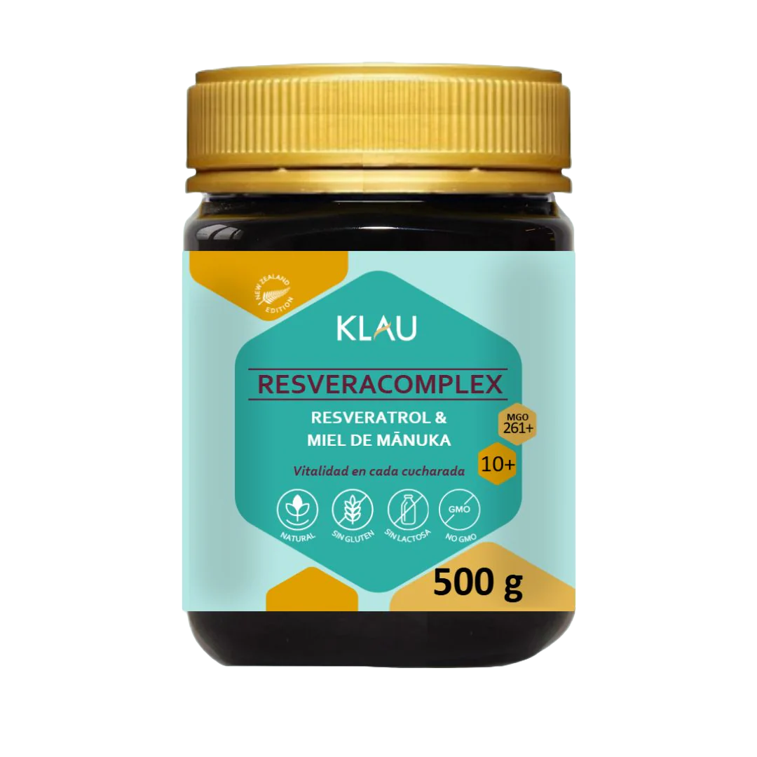 Descubre Resveracomplex, una fusión revolucionaria que combina la exclusiva Miel de Manuka 10+ (MGO 261+) —una de las más potentes del mundo— con resveratrol de alta pureza, un activador natural de las sirtuinas, proteínas clave en la regeneración celular, la protección del ADN y la lucha contra el envejecimiento.